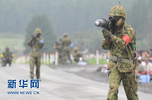 资料图片:8月24日,参演士兵在日本陆上自卫队2010年富士综合火力演习上展示110毫米单兵反坦克武器。当日,日本陆上自卫队开始在富士山下的静冈县御殿场市东富士演习场举行2010年综合火力演习。 新华社记者 季春鹏 摄