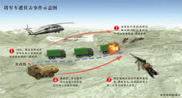塔吉克斯坦官员20日表示,一批被雇佣的伊斯兰极端武装分子在该国境内与阿富汗交界地区伏击了军车,导致至少23名军人身亡。