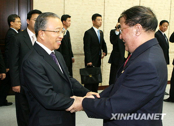 资料图:09年9月,戴秉国(前左)与时任朝鲜第一副外相的姜锡柱(前右)握手。新华社记者张滨阳 摄