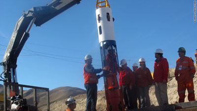 当救援通道完全打通后,工作人员将把这种救生舱放入井下,救生舱大概有一人大小,可以将井下矿工一个接一个的运送出洞。智利政府表示,如果进展顺利,他们可能将于11月初或者更早被救出。