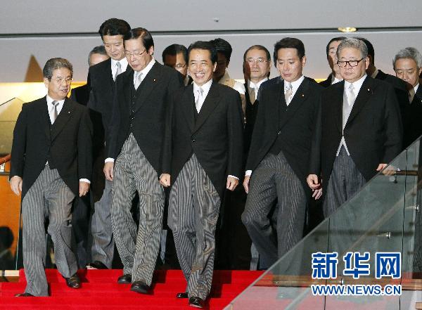 9月17日,在日本东京,日本首相菅直人(中)率新一届内阁成员在官邸亮相。当日,日本首相菅直人组建新一届内阁。 新华社/路透
