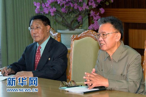 资料图片:这是朝鲜最高领导人金正日(右)与2010年9月23日被任命为朝鲜内阁副总理的姜锡柱在朝鲜首都平壤出席会议的资料照片(2009年8月4日摄)。 新华社/法新