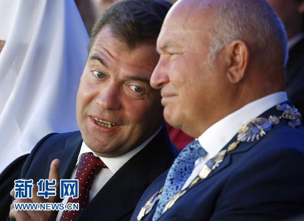 资料图 2009年9月5日,梅德韦杰夫(左)与卢日科夫交谈。 新华社/路透