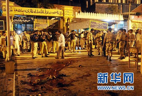 10月7日,在巴基斯坦南部港口城市卡拉奇,安全人员封锁爆炸现场。卡拉奇一座神殿当晚发生两起自杀式炸弹袭击,造成至少14人死亡、70多人受伤。新华社/法新
