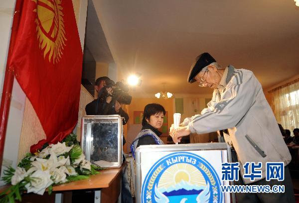 2010年10月10日,在吉尔吉斯斯坦首都比什凯克一个投票站,一名老人参加议会选举投票。新华社记者沙达提摄