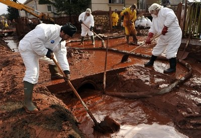 匈牙利工人正在清理废毒水泄漏造成的淤泥(来源:美国媒体)