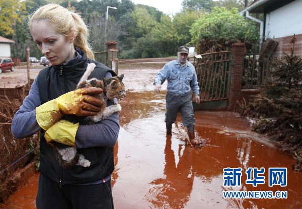 10月5日,在匈牙利首都布达佩斯以西150公里的一个村庄,当地居民抱着一只猫离开被有毒废水覆盖的地面。新华社/路透