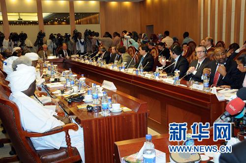 10月9日,联合国安理会成员国常驻联合国代表组成的代表团在苏丹外交部举行了会谈,讨论了苏丹南部地区将在明年1月举行的公投以及达尔富尔形势等问题。新华社发(穆罕默德·巴比克尔摄)