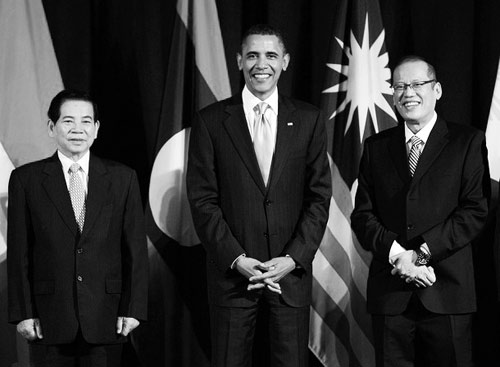 美国总统奥巴马在9月举行的东盟峰会上重提南海问题。图为奥巴马与东盟10 国领导人合影,左为越南国家主席阮明哲,右为菲律宾总统阿基诺三世。