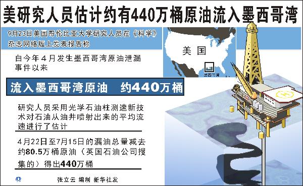 2010年9月24日 图表:美研究人员估计约有440万桶原油流入墨西哥湾 新华社发