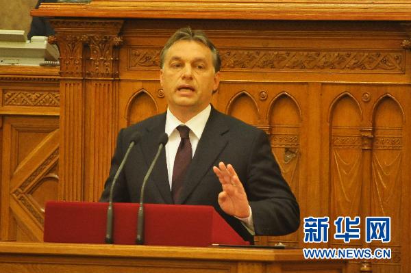 10月11日,在匈牙利首都布达佩斯,匈牙利总理欧尔班在国会会议上讲话。新华社发(托尔科·道尼摄)