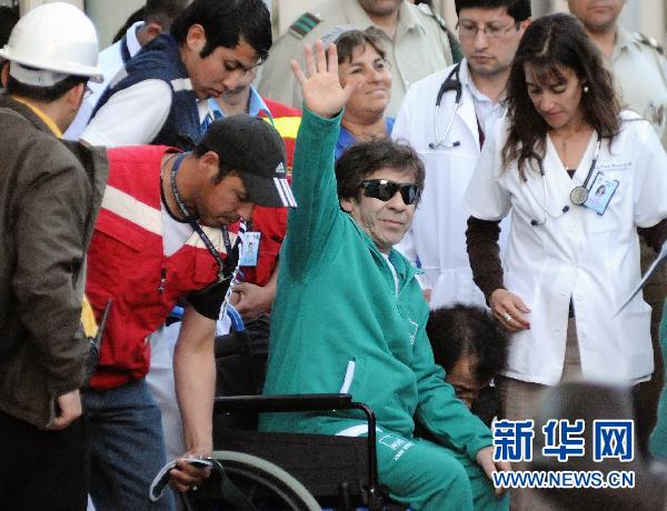10月13日,第21名获救矿工永尼·巴里奥斯(中)抵达智利科皮亚波地区医院时向人们挥手致意。智利圣何塞铜矿最后一名被困矿工路易斯·乌尔祖阿当地时间13日晚成功升井获救。至此,该铜矿33名被困矿工全部顺利获救。新华社发(尼古拉斯·塞拉亚摄)
