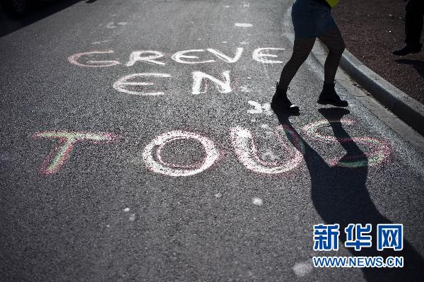 10月13日,在法国谢纳,一女子走过写有“人人都来参加罢工”的路面。新华社/法新