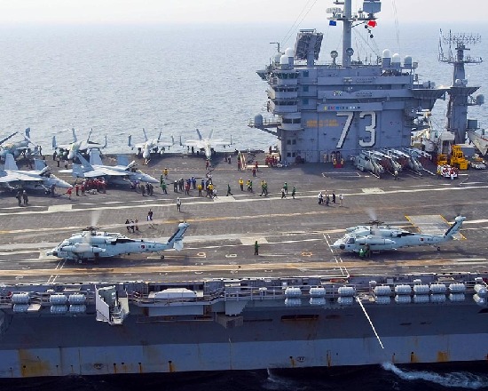 7月27日,韩美军演继续进行,从韩国“独岛”号运输舰起飞的SH-60S“海鹰”直升机降落在美军“华盛顿”号航母上。来源:美国海军网站
