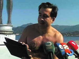 日前,格鲁吉亚总统萨卡什维利在沿海城市巴统视察。在大海游泳过后,穿着泳裤的萨卡什维利一边使用iPad一边接受记者采访。