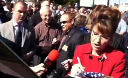 佩林在出席集会时,支持者递给她帽子、球衣和书籍以获得签名。而当有人递上国旗时,她也毫不犹豫的用记号笔在旗面上挥笔写下自己的名字,而后还挥动国旗并将其送还给支持者。