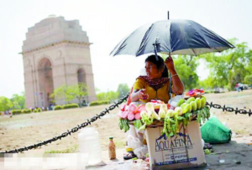 一名小贩在印度首都新德里的印度门前兜售水果。
