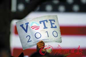 图为22日,美国总统奥巴马到加利福尼亚州拉选票,他的支持者高举拉票标语。