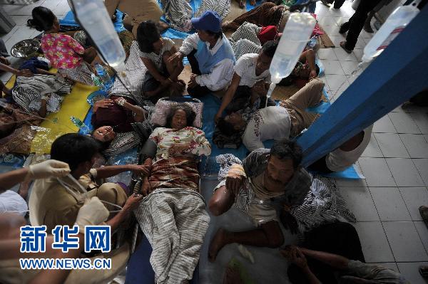 10月28日,在印度尼西亚西苏门答腊省明打威群岛的北巴盖岛一个小村庄,在海啸中受伤的村民接受医护人员治疗。 新华社/法新