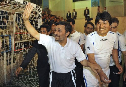 据外电报道,伊朗总统穆罕默德·内贾德和玻利维亚总统莫拉莱斯长久以来因相似的政治立场和对美国的尖锐批评而为世界所瞩目。现在,他们又站在同一阵营中,不过这一次是在五人制足球场上。