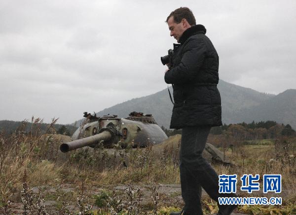 11月1日,俄罗斯总统梅德韦杰夫在南千岛群岛(日本称北方四岛)的国后岛视察。 新华社/俄新社