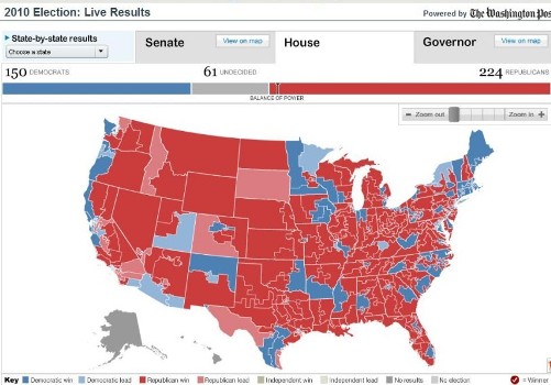 总统奥巴马所在的民主党在众议院已开出的席位中获得了150个席位;而其最大对手——共和党在已开出的席位中,已占据224个席位。还有61个议席等待开出。