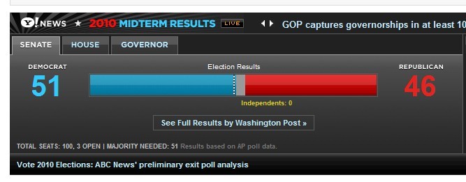 据报道,《华盛顿邮报》最新出口民调结果显示,在美国2010年中期选举当中,总统奥巴马所在的民主党在参议院已开出的97个席位中获得了51个席位,超过参议院100个议席中的半数,获得了参议院掌控权。