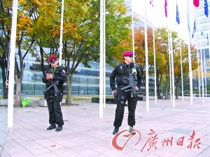 首尔会展中心外的警察在巡逻。 本报特派记者 李明波、蒋林 摄