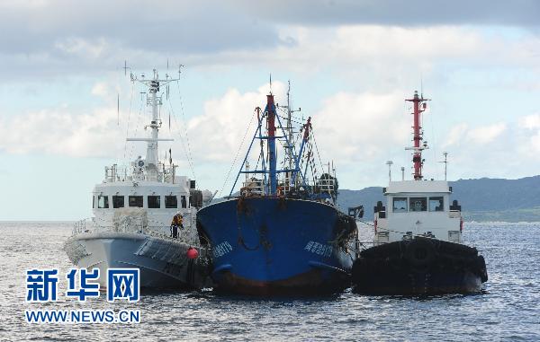资料图片:2010年9月12日,日本海上保安厅的两艘巡逻船将中国渔船夹在中间。当天,日本海上保安厅将中国渔船拖到冲绳县石垣港附近海域进行了模拟海上作业检查。 新华社记者 季春鹏 摄