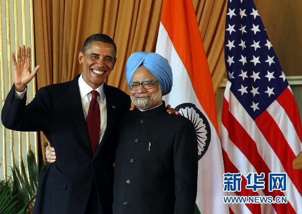 11月8日,在印度首都新德里,印总理辛格(右)与来访的美国总统奥巴马一同出席新闻发布会。新华社发(帕萨·萨卡尔摄)