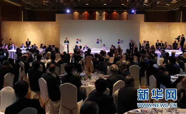 11月12日,在韩国首尔洲际酒店内,韩国总统李明博致祝酒辞。二十国集团首尔峰会当日下午结束为期两天的日程,在通过《首尔宣言》后闭幕。韩国总统李明博和各国领导人在韩国首尔洲际酒店内举行特别晚宴,庆祝峰会圆满结束。新华社/韩联社