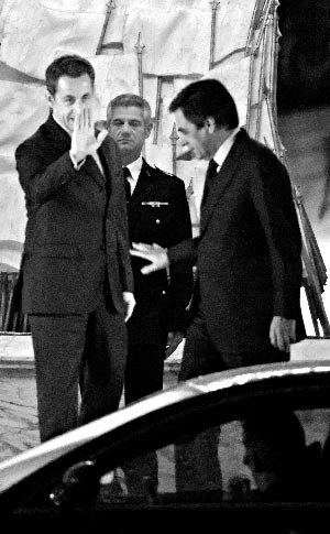 13日,法国总统萨科齐在爱丽舍宫外与菲永短暂“告别”。