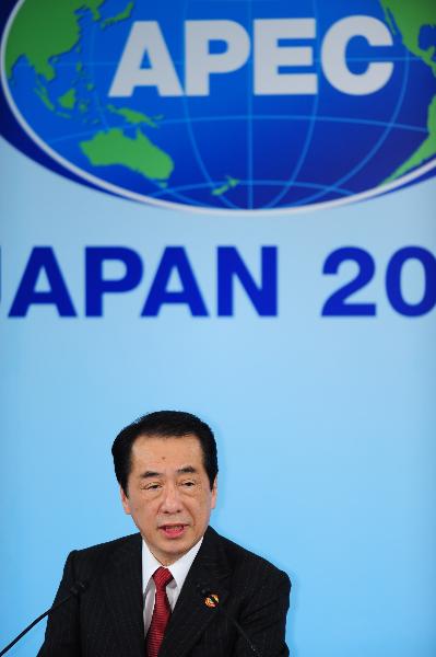 11月14日,在日本横滨,日本首相菅直人在记者会上回答记者提问。当日,亚太经合组织(APEC)第十八次领导人非正式会议在日本横滨闭幕。会后,日本首相菅直人召开记者会,回答记者提问。 新华社记者季春鹏 摄