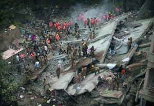 16日,印度新德里,救援人员在楼房坍塌现场。