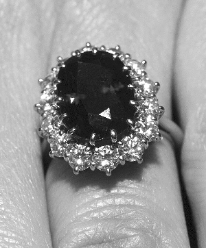 订婚戒指中间是一颗12克拉的蓝宝石,周围镶嵌14颗小钻石。