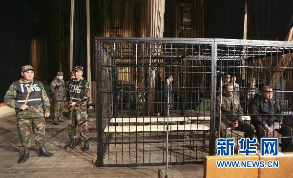 11月17日,吉尔吉斯斯坦前国防部长卡利耶夫(前右一)等人在比什凯克出庭。新华社/路透