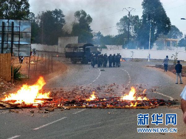 11月17日,在马达加斯加首都塔那那利佛机场附近,军人站在燃烧的路障前。马达加斯加过渡权力机构17日对新修订宪法草案进行全民公投,当天在马首都伊瓦多机场附近发生了军人闹事事件。事件发生后,马过渡政府总理维达尔将军举行记者招待会,呼吁人民和军队保持稳定。他称少数军官闹事的目的是扰乱全民公投,阻挠解决政治危机。新华社/法新