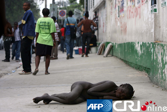 海地首都太子港,一名贫困女子赤裸着身体病倒在大街上。图片来源:(AFP/国际在线)