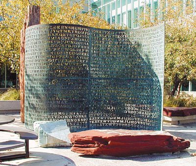 该面板名为“克里普托斯”(Kryptos,在希腊文解作“隐藏的”),由艺术家桑伯恩于20世纪90年代制成。它分为两部分,左边的面板雕上有待解密的文字,暗藏4段谜语;右面两片面板则雕上用以解密的“钥匙”。