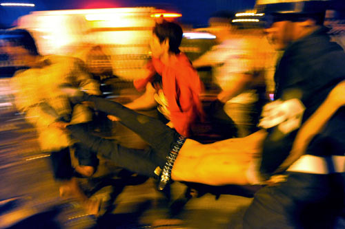 图为23日,柬埔寨金边,人们站在踩踏事件遇难者遗体旁。