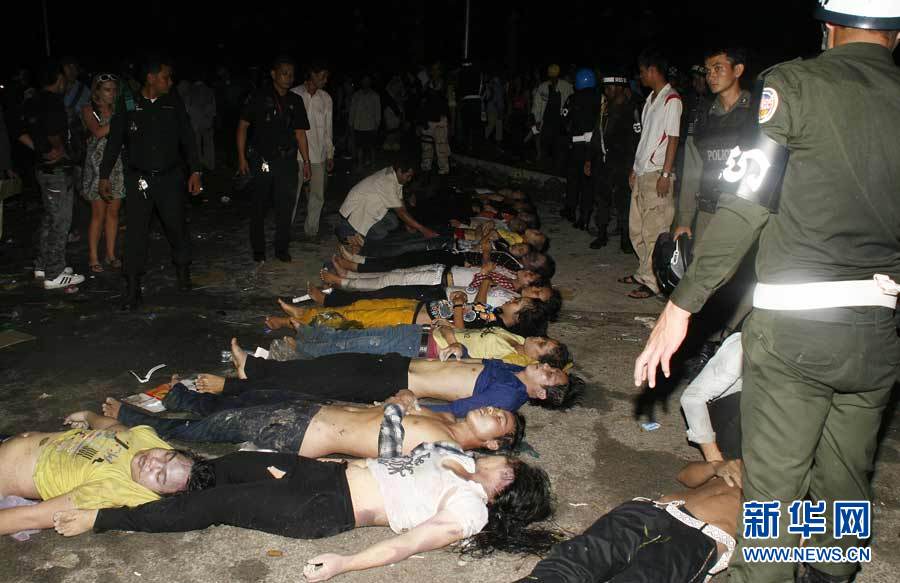 11月23日,在柬埔寨金边,人们站在踩踏事件遇难者遗体旁。新华社发(披隆摄)