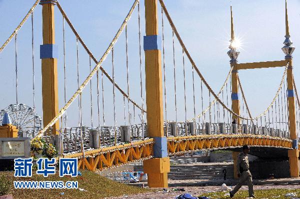 11月24日,在柬埔寨金边市,一名警察从发生踩踏惨案的钻石岛桥边走过。柬埔寨国家警察副总监和金边踩踏事故调查特别委员会副主席索帕当天说,22日发生的钻石岛桥踩踏惨案是因桥身晃动引起恐慌造成的。新华社/法新