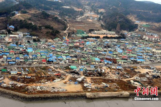 当地时间23日下午2时34分许,朝鲜向韩国一侧的延坪岛附近发射海岸炮炮弹,其中数枚落在有居民居住的岛上,导致数十栋建筑起火或受损。图为从空中拍摄的被炮弹击中地区。