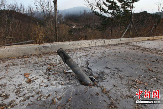 当地时间23日下午2时34分许,朝鲜向韩国一侧的延坪岛附近发射海岸炮炮弹,其中数枚落在有居民居住的岛上,导致数十栋建筑起火或受损。图为延坪岛上一枚未爆炸的炮弹。