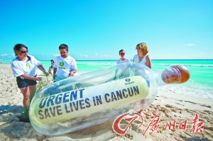 慈善组织在坎昆海滩放出一个巨大的漂流瓶,上面写着“十万火急,在坎昆挽救生命”。