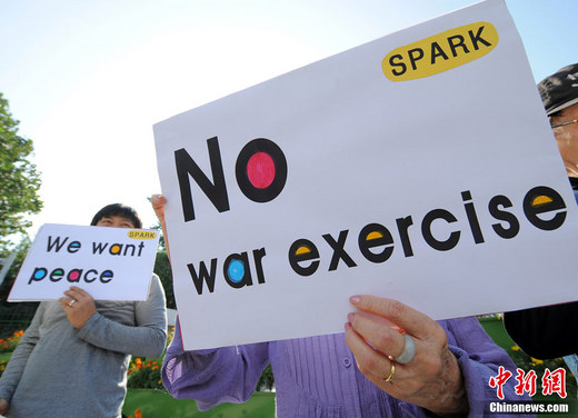 韩美反潜联合军事演习2010年9月27日在韩国西部海域(黄海)拉开帷幕。当日,一些韩国反战人士在国防部门前集会抗议美韩联合军演。