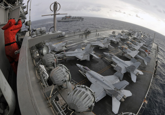 12月2日,美国海军乔治-华盛顿号航母战斗群在朝鲜半岛西部海域进行物资补给作业,为即将到来的美日联合军演做准备。乔治-华盛顿号航母刚刚结束与韩国海军进行的为期三天的黄海联合军演。