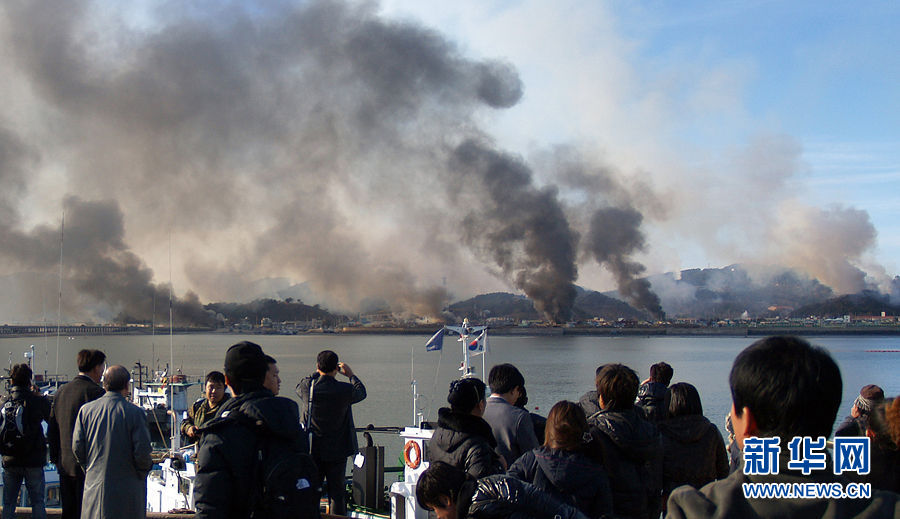 11月23日,人们观望韩国西部延坪岛上的滚滚硝烟。新华社/路透