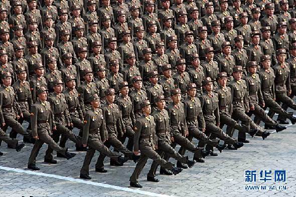 10月10日,在朝鲜首都平壤,受阅部队接受检阅。朝鲜10日上午在平壤金日成广场举行盛大阅兵式,庆祝朝鲜劳动党成立65周年。 新华社记者姚大伟摄