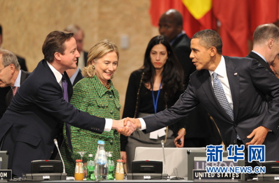 11月19日,在葡萄牙首都里斯本,美国总统奥巴马(右)与英国首相卡梅伦(左)出席北约峰会首日会议时握手。新华社记者武巍摄。